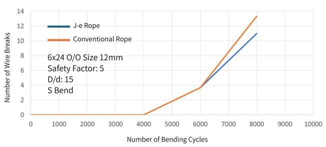 Beyond 6,000 cycles, the conventional rope exhibited a higher number of wire breaks.